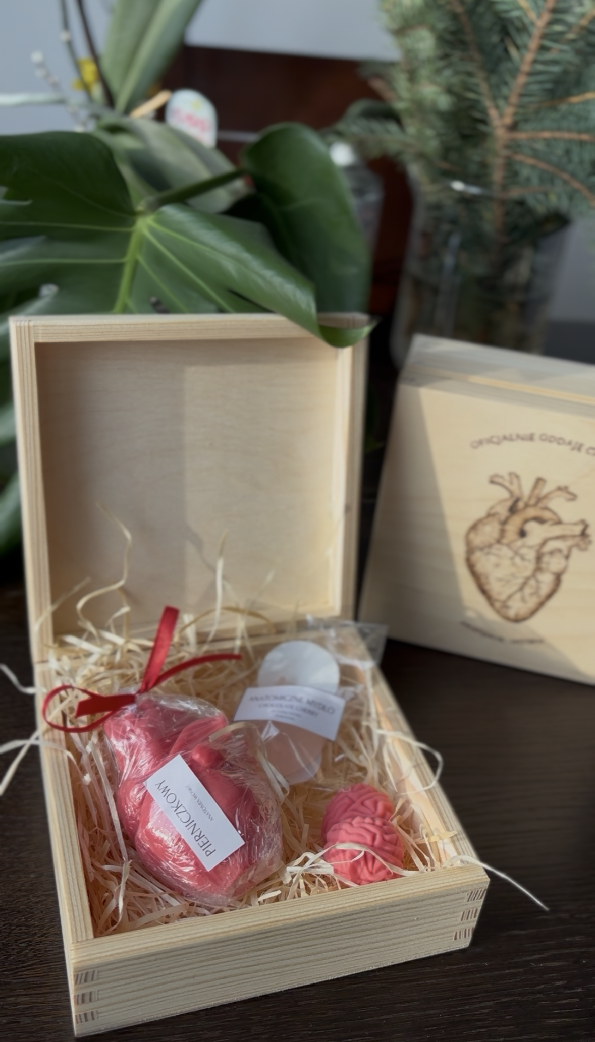 🫀Całość zapakowana w ręcznie wypalany, drewniany kufer o wymiarach 16 × 16 × 7 cm, przewiązana czerwoną wstążką – gotowa do wręczenia jako efektowny, prezent..