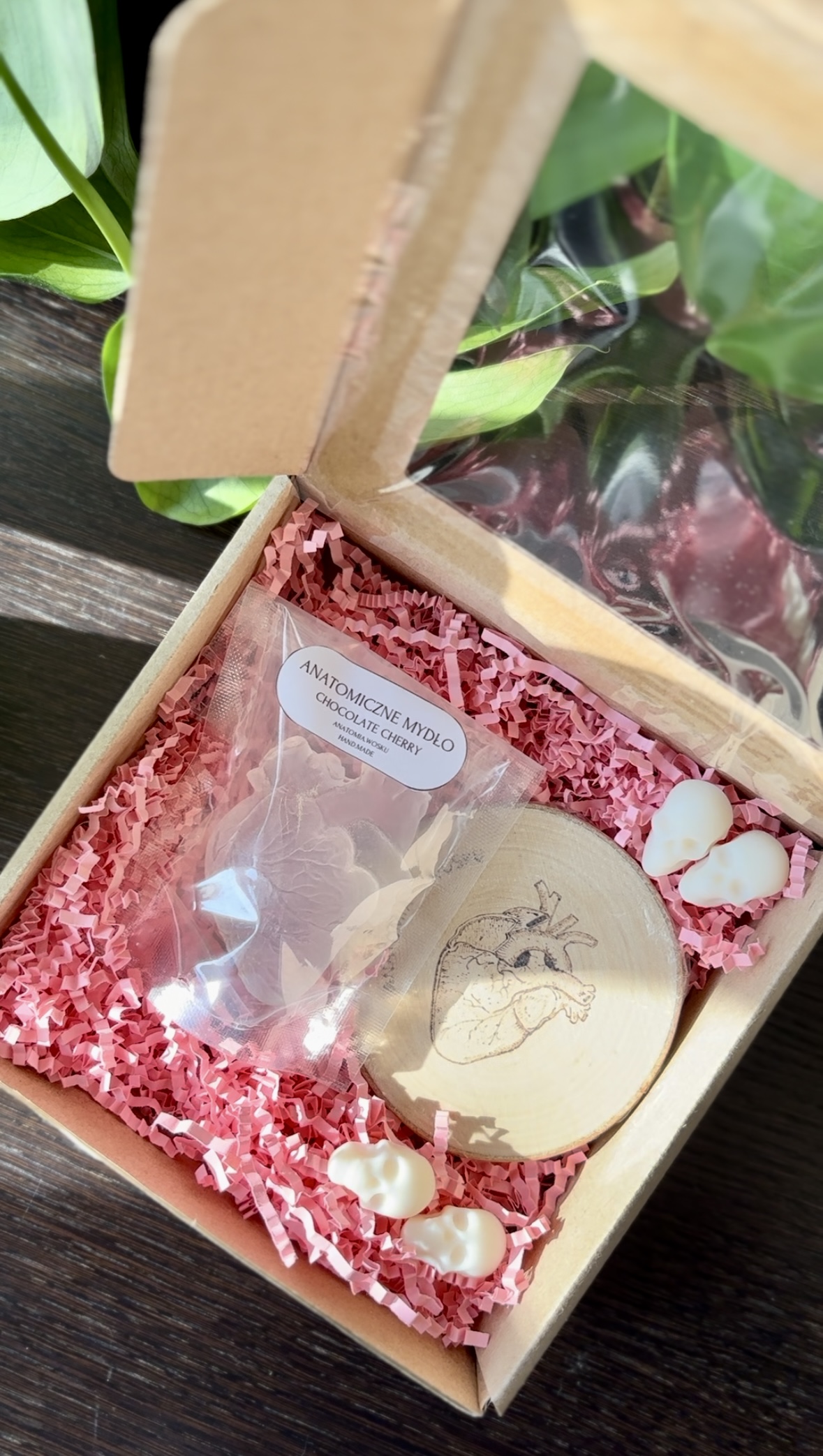 Anatomiczny zestaw mydlany – ręcznie wykonane mydełko glicerynowe w kształcie serca (40 g) o aromacie chocolate-cherry + anatomiczna podstawka.