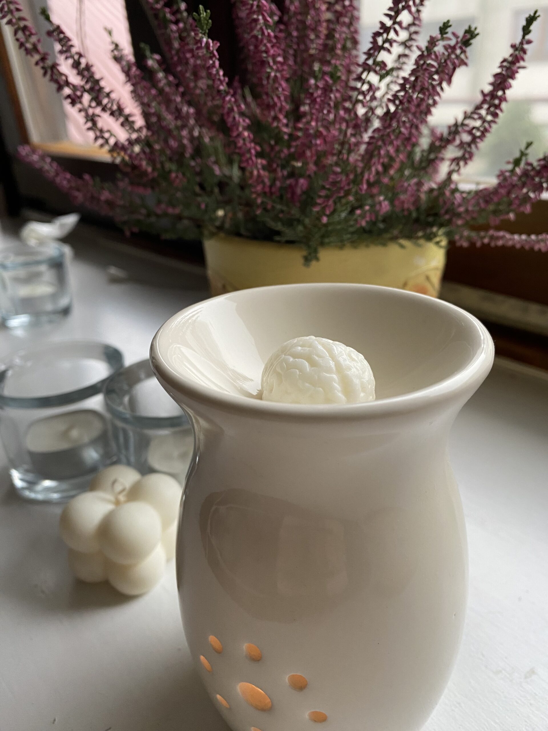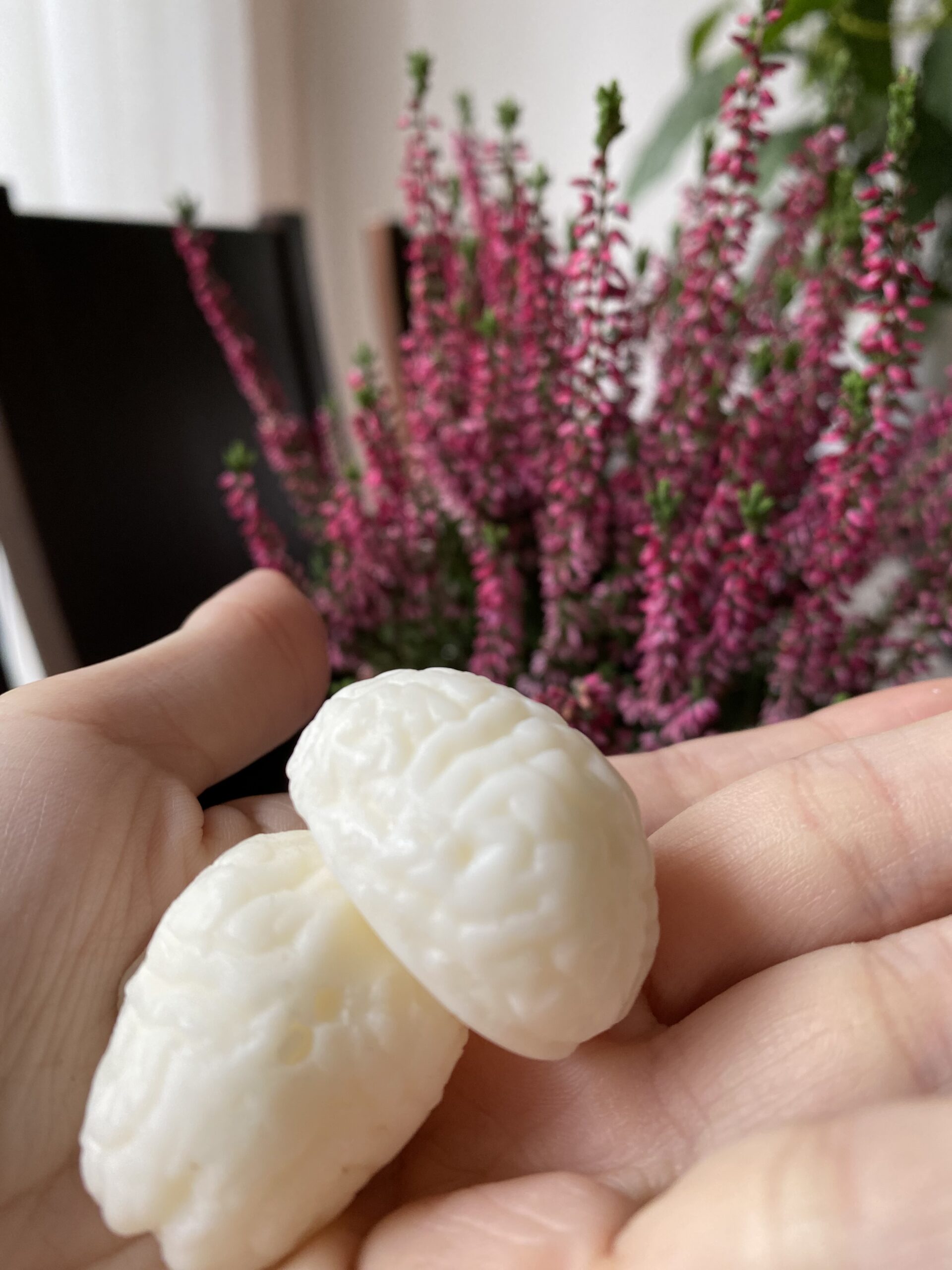 Wyjątkowy zestaw 4 ręcznie wykonanych wosków do kominka zapachowego w kształcie mózgu – idealny dla miłośników anatomii i unikalnych dekoracji.