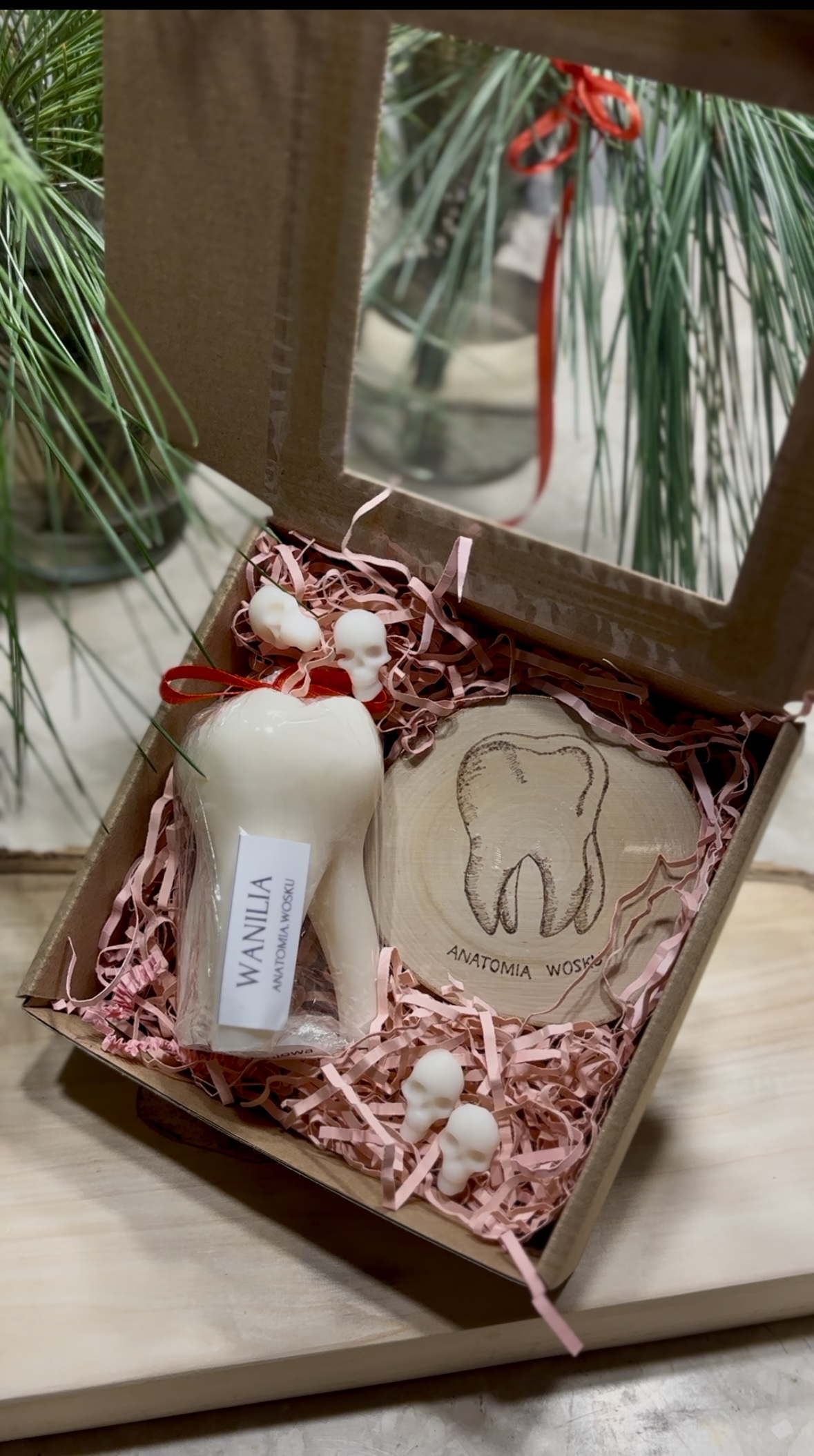 🦷Zębowy zestaw sojowy – ręcznie wykonana świeca w kształcie zęba wraz z anatomiczną zębową podstawką.